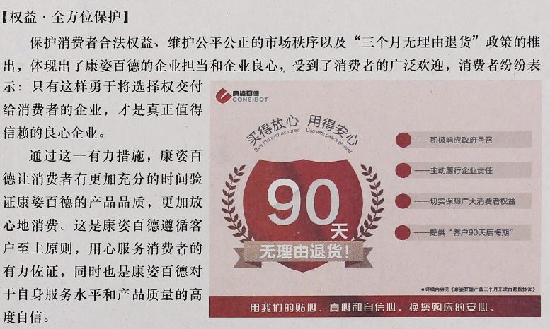 【權(quán)益·全方位保護(hù)】保護(hù)消費(fèi)者合法權(quán)益、維護(hù)公平公正的市場秩序以及“三個月無理由退貨”政策的推出,體現(xiàn)出了康姿百德的企業(yè)擔(dān)當(dāng)和企業(yè)良心,受到了消費(fèi)者的廣泛歡迎,消費(fèi)者紛紛表示:只有這樣勇于將選擇權(quán)交付給消費(fèi)者的企業(yè),才是真正值得信賴的良心企業(yè)。