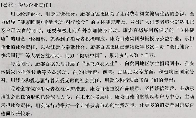 【公益·彰顯企業(yè)責(zé)任】用心經(jīng)營企業(yè),用愛回饋社會。康姿百德集團(tuán)為了讓消費(fèi)者樹立健康生活的意識,全力倡導(dǎo)“健康睡眠+適量運(yùn)動+科學(xué)飲食”的立體健康理念,號召廣大消費(fèi)者追求舒適睡眠及合理飲食的同時,還要積極走向戶外參加健身活動??底税俚录瘓F(tuán)所倡導(dǎo)的“立體健康”的理念一經(jīng)推出,就得到了消費(fèi)者積極響應(yīng)??底税俚录瘓F(tuán)積極投身公益事業(yè),承擔(dān)企業(yè)的社會責(zé)任,以赤誠愛心奉獻(xiàn)社會。