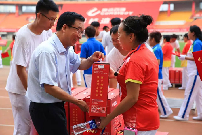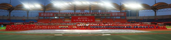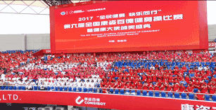 伴隨著優(yōu)美激昂的《走向復興》音樂,一幅寫有“讓科技造福生命”、面積為608平方米的巨型紅旗步入賽場。康姿百德91名工作人員共舉旗幟,整齊自如地緩緩前行,給人以極大的視覺沖擊!