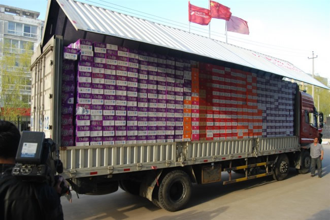 25日上午9點,物資車到達(dá)石家莊。石家莊康姿百德總代理李志華,代表新華區(qū)、裕華區(qū)、橋西區(qū)、橋東區(qū)、長安區(qū)、開發(fā)區(qū)、辛集市、平山縣、藁城縣、正定縣等地的代理商將愛心物資裝上貨車