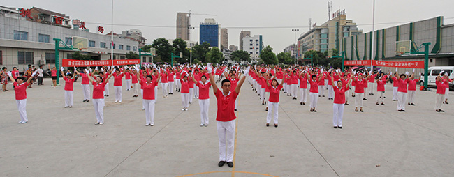 8月8日一大早,為迎接第六個“全民健身日”的到來,浙江仙居廣大市民相約來到城區(qū)西門,伴隨著優(yōu)美的樂曲,共同舞起康姿百德健身操,向人們展示激情與活力。動聽的音樂、優(yōu)美的舞姿,引得行人不時駐足觀看,開心幸福的笑容蕩漾在每個人的臉上,全民健身的理念也深深扎根于每個人的心中。 本次活動得到了當?shù)赜嘘P部門和新聞媒體的關注,仙居電視臺進行了現(xiàn)場采訪,并于當晚在仙居綜合頻道播出。