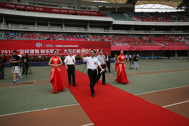 為全面展示康姿百德2014“全民健身快樂同行”大型公益活動的成果,進一步把全民健身活動引向深入,來自全國各地的257個代表隊、11000多人進行了氣勢恢宏的康姿百德健身操展演。伴隨著耳熟能詳?shù)男桑鞔黻犚来稳雸?,一面面隊旗迎風高揚,一排排隊伍整齊劃一,節(jié)奏明快的旋律和優(yōu)美舒暢的動作有機融合,彰顯出了“我運動、我健康、我快樂”的健身風采和大家對幸福生活的追求,把人們帶入了一個五彩繽紛的歌舞世界。晚上7點30分,經(jīng)過6個多小時的展演,活動在燈火閃爍的夜色中緩緩落幕。