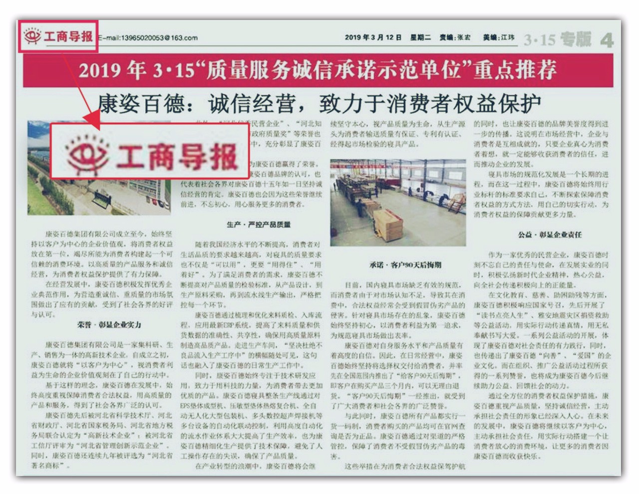 3·15消費者權(quán)益日來臨之際,康姿百德受邀參加2019紀(jì)念“3?15”國際消費者權(quán)益日座談會,《中國消費者報》等多家權(quán)威媒體也相繼對康姿百德進(jìn)行報道。