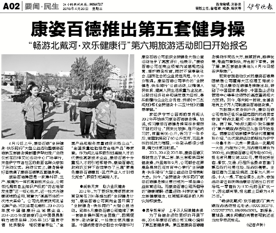 2016年4月初,康姿百德“全民健身·快樂同行”大型公益活動暨康姿百德第五套健身操啟動儀式相繼在北戴河、南昌舉行,此次新疆站是健身操啟動儀式的第三站?!兑晾缛請蟆?、《伊犁晚報》等媒體對此次活動進行了報道。