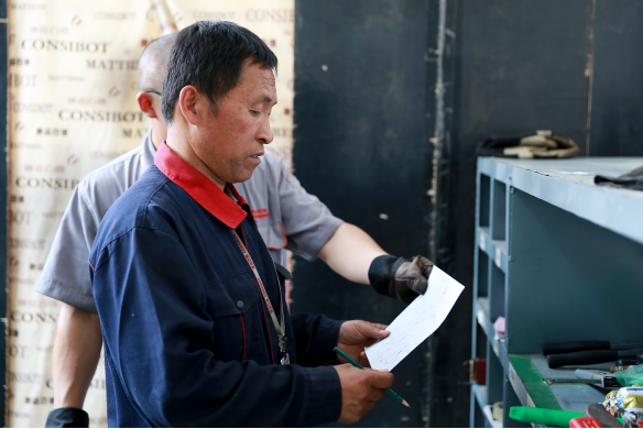馮國成和同事研究組裝車間頂升設備技術(shù)革新