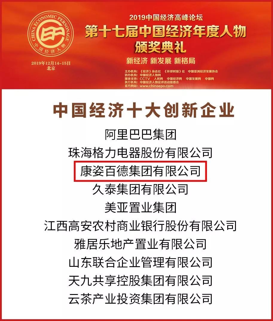 2019年12月15日,以“新經(jīng)濟(jì)、新發(fā)展、新格局”為主題,由《經(jīng)濟(jì)》雜志社、《環(huán)球時(shí)報(bào)》社、中國(guó)亞洲經(jīng)濟(jì)發(fā)展協(xié)會(huì)聯(lián)合舉辦的“2019中國(guó)經(jīng)濟(jì)高峰論壇暨第十七屆中國(guó)經(jīng)濟(jì)人物年會(huì)” 在京隆重舉行。康姿百德集團(tuán)榮獲“中國(guó)經(jīng)濟(jì)十大創(chuàng)新企業(yè)”榮譽(yù)稱號(hào)。