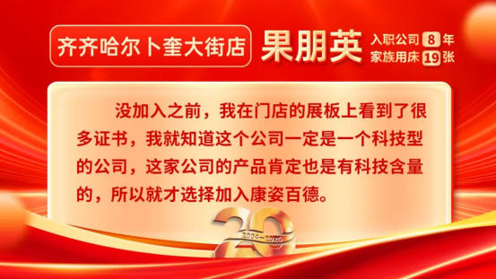 談到為什么加入康姿百德,果朋英說道:“沒加入之前,我在門店的展板上看到了很多證書,我就知道這個公司一定是一個科技型的公司,這家公司的產(chǎn)品肯定也是有科技含量的,所以就才選擇加入康姿百德。”