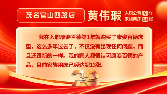 黃偉瑕說(shuō)道:“我在入職康姿百德第1年就購(gòu)買了康姿百德床墊,這么多年過(guò)去了,不僅沒(méi)有出現(xiàn)任何問(wèn)題,而且還跟新的一樣。我的家人都很認(rèn)可康姿百德的產(chǎn)品,目前家族用床已經(jīng)達(dá)到13張。我目前最大的愿望就是要讓更多消費(fèi)者知道康姿百德這個(gè)品牌,認(rèn)可康姿百德,讓康姿百德成為廣東茂名地區(qū)有影響力的寢具品牌。”