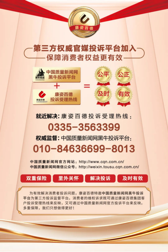 多年來,康姿百德認真踐行“以客戶為中心”的企業(yè)核心價值觀,高度重視消費者的需求和體驗。康姿百德集團已于2024年3月加入了全國消協(xié)“智慧315”消費維權(quán)投訴平臺。除此之外,康姿百德還特邀中國質(zhì)量新聞網(wǎng)黑牛投訴平臺作為企業(yè)第三方投訴監(jiān)督平臺,并統(tǒng)一制作監(jiān)督舉報公示牌懸掛在全國所有門店內(nèi),主動接受消費者的監(jiān)督。