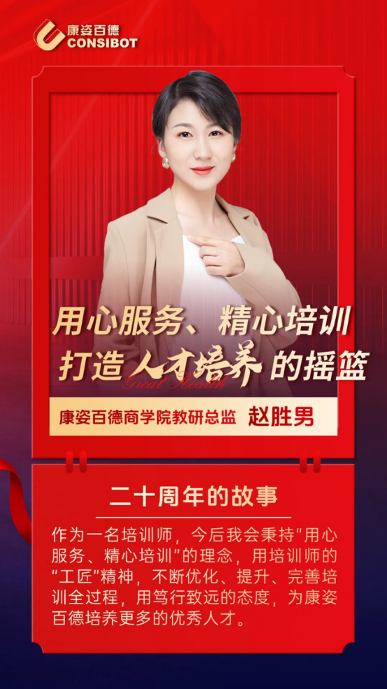 今年是康姿百德集團成立20周年。在20年的發(fā)展歷程中,涌現(xiàn)出一大批在經(jīng)營管理、原料采購、品牌宣傳、暖心服務(wù)、人才引進和培訓(xùn)等各個領(lǐng)域立足崗位、奉獻(xiàn)建功的優(yōu)秀代表。讓我們一起看看這些榜樣故事。本期帶你走進康姿百德商學(xué)院教研總監(jiān)趙勝男、教學(xué)總監(jiān)沈劍坤和教務(wù)總監(jiān)張留根。