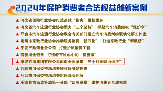 節(jié)目中,河北省消費者權(quán)益保護委員會秘書長王守用現(xiàn)場宣布了2024年保護消費者合法權(quán)益創(chuàng)新案例。康姿百德集團有限公司面向全國承諾“三個月無理由退貨”,成功入選。